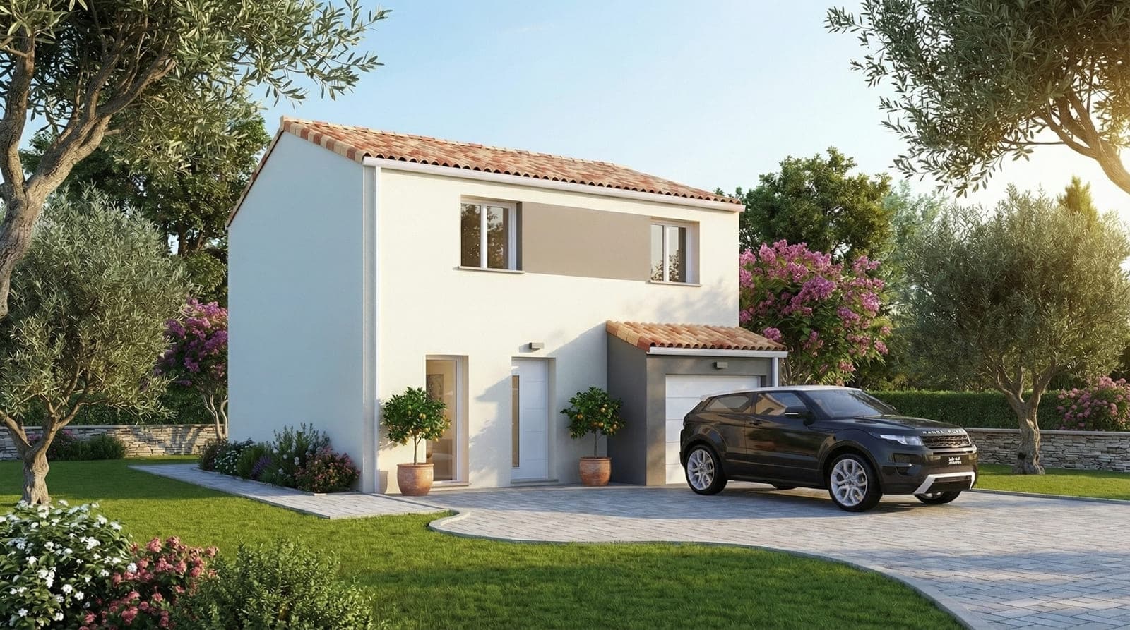 À l’extérieur, l’élégance est de mise. Le garage accolé avec une coloration bi-ton donne un charme fou à cette maison. A noter qu’une seconde version existe avec un garage intégré